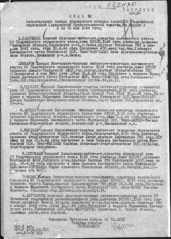 Похоронен: Молдавская ССР, Бендерский уезд, д. Меренешть