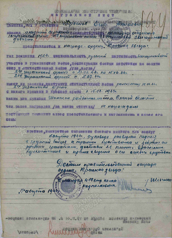 Дата и место призыва: 15.03.1943г., Ишимский РВК, Омская обл.