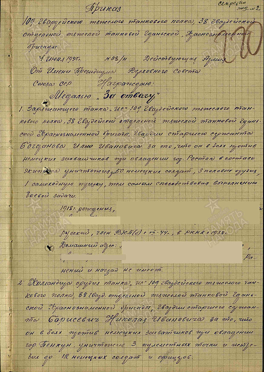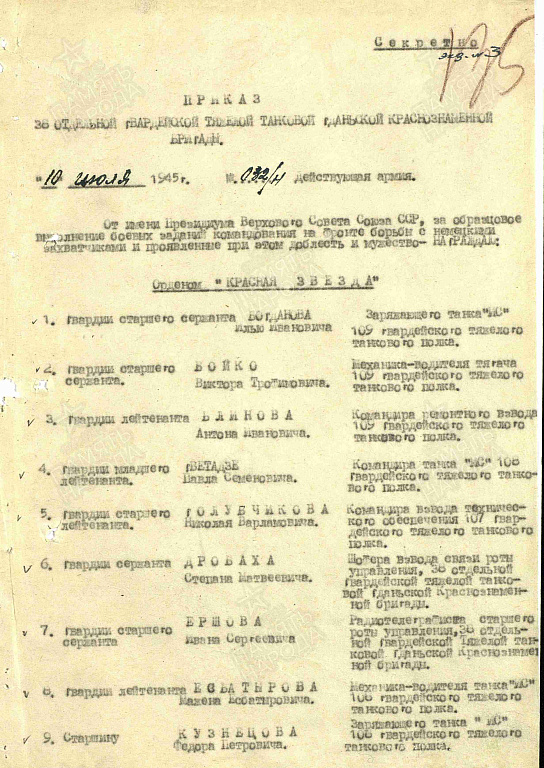Место службы: 109 гвардейский тяжелый танковый полк