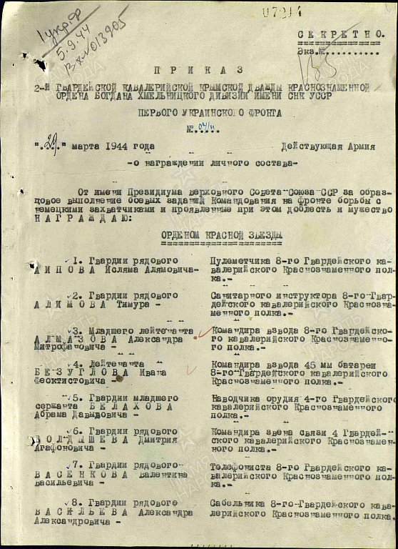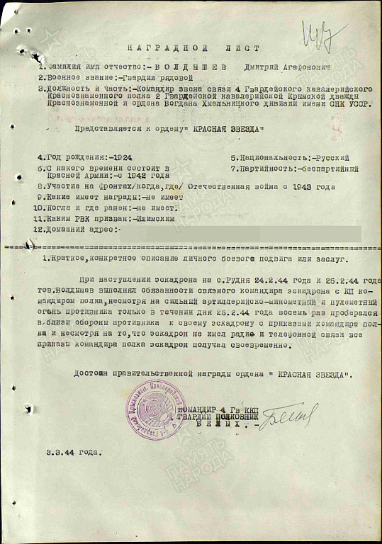 Место призыва: __.__.1942 г. Ишимский РВК, Тюменская обл.