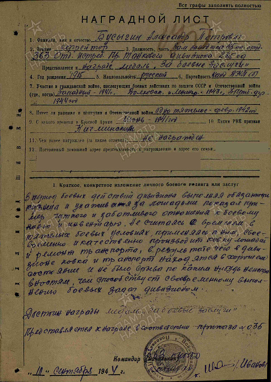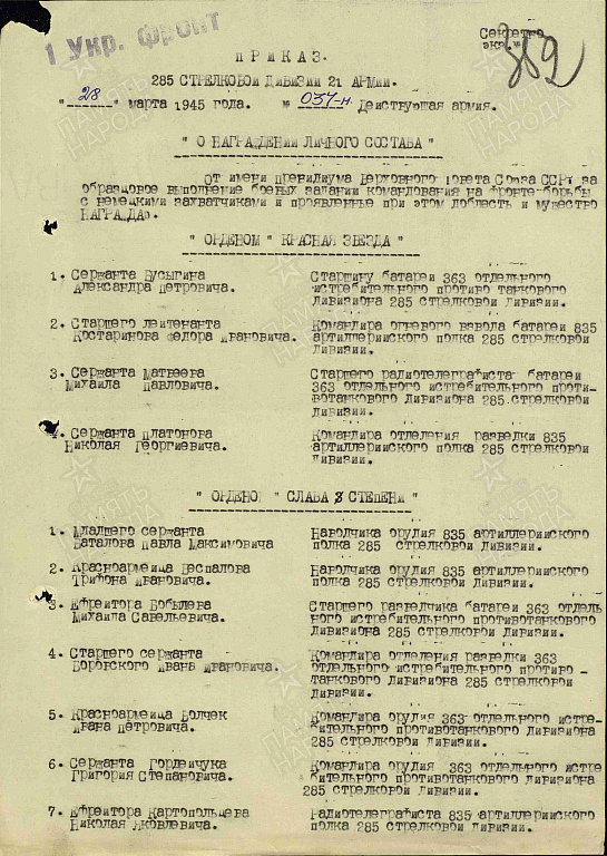 Место службы: 285 стрелковая дивизия 363 отдельный истребительно-противотанковый дивизион