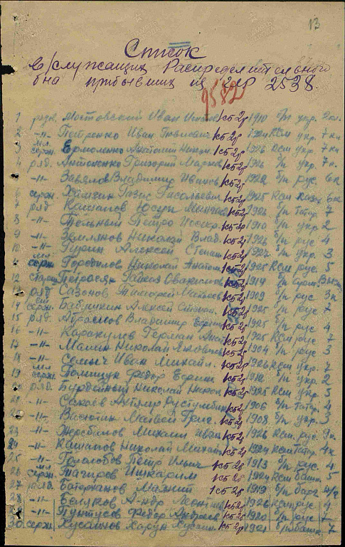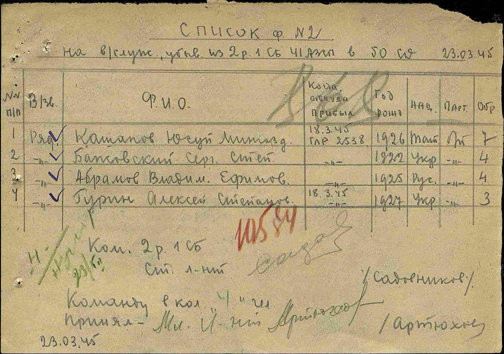 Дата и место призыва:15.10. 1944 г. Убинским РВК, Тюменская обл.