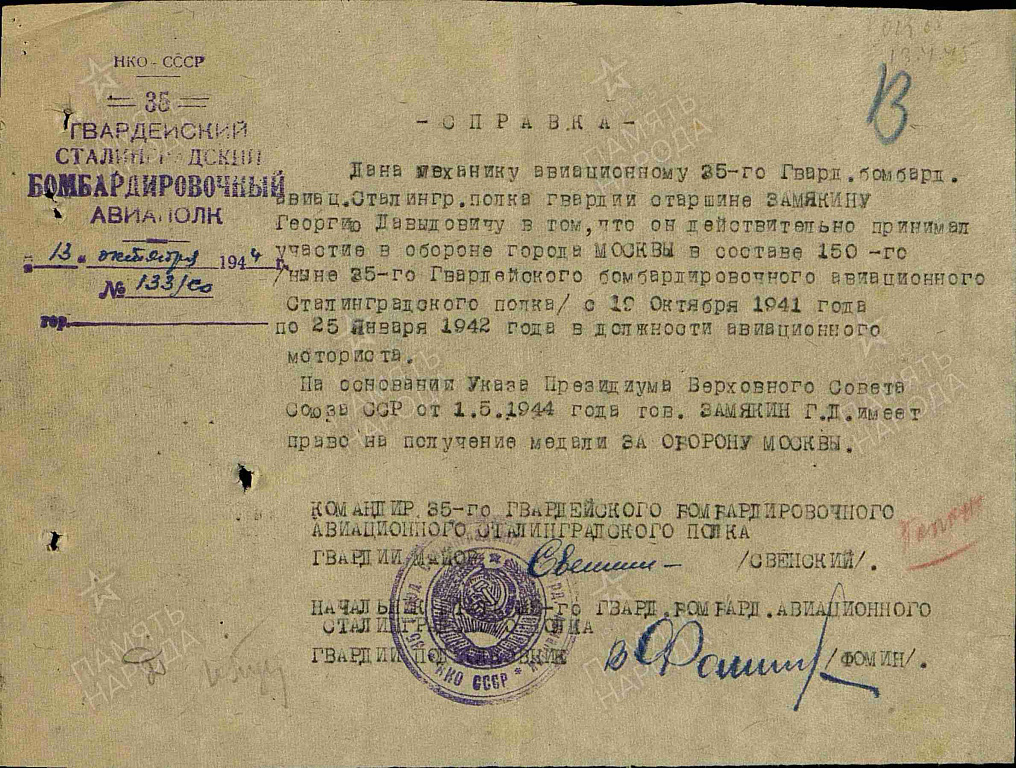 Место службы: 35 гвардейский бомбардировочный авиационный полк
