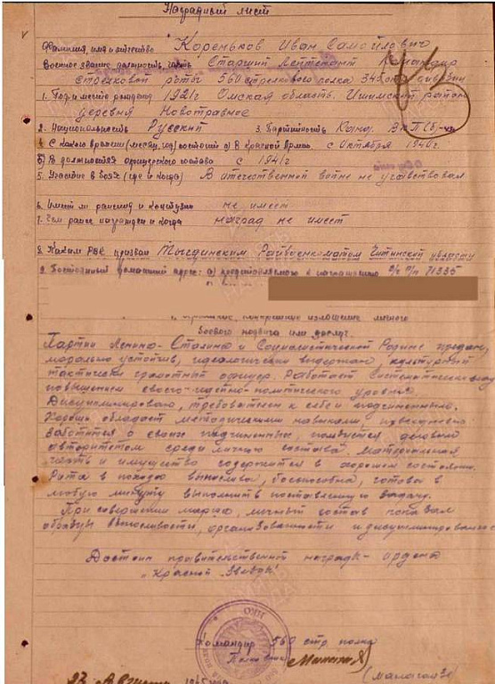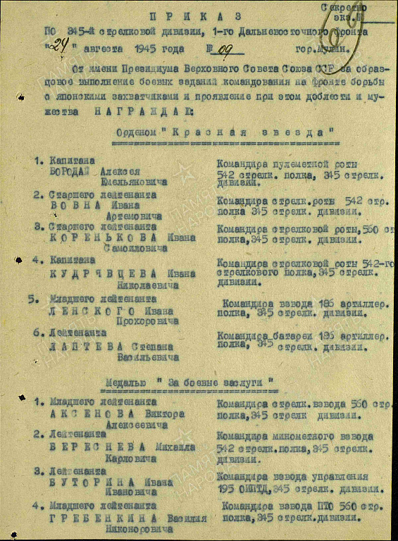 Место службы: 1 стрелковый полк Усть-Сунгарийский УР 15 Армия ДВФ; 560 стрелковый полк 345 стрелковая дивизия 2 Армия