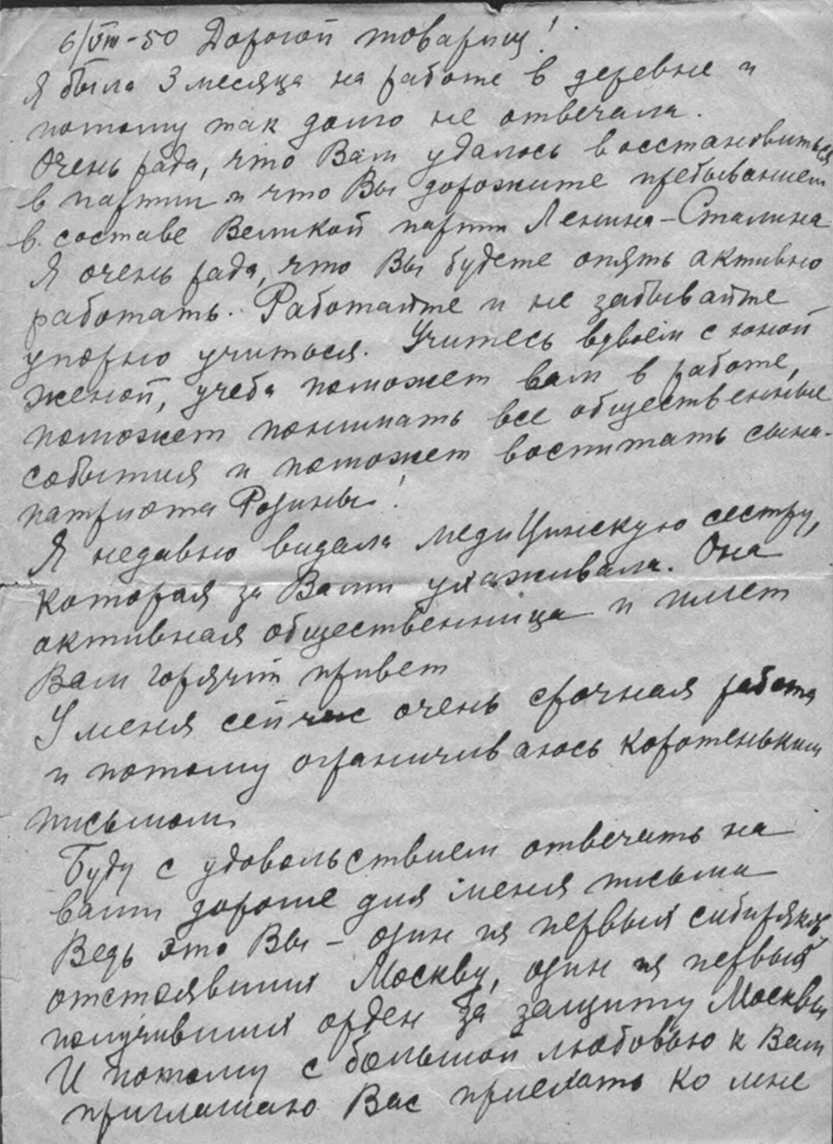 Отец вел переписку со своим лечащим врачом Дорой Матвеевной Ходос (первое ранение в декабре 1941 года или начале 1942 г. - прим. автора), которая решила написать правдивую книгу о прошедшей войне, в том числе и о моем отце, как непосредственном участнике событий. В семейном архиве сохранилось одно из ее писем. Привожу выдержку из письма: " ...я недавно видела медицинскую сестру, которая за Вами ухаживала. Она активная общественница и шлет Вам горячий привет. У меня сейчас очень срочная работа и поэтому ограничиваюсь коротеньким письмом. Буду с удовольствием отвечать на Ваши дорогие для меня письма. Ведь это Вы – один из первых сибиряков, отстоявших Москву, один из первых, получивших орден за защиту Москвы. И потому с большой любовью к Вам приглашаю Вас приехать ко мне в 1951 году смотреть послевоенную Москву и сельхозвыставку. Ваш старый друг Д. Ходос. 6.VIII.1950 г. Горячий привет жене и поцелуй сыну»