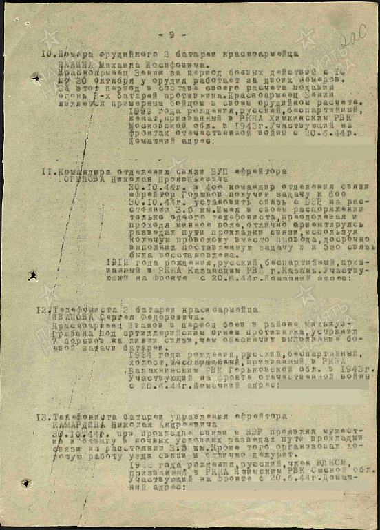 Дата и место призыва:20.06.1944 Ишимский РВК, Омская обл., Ишимский р-н
