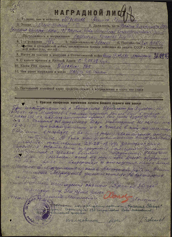Место службы: 195 стрелковая дивизия 475 артиллерийский полк 195 стрелковой дивизии