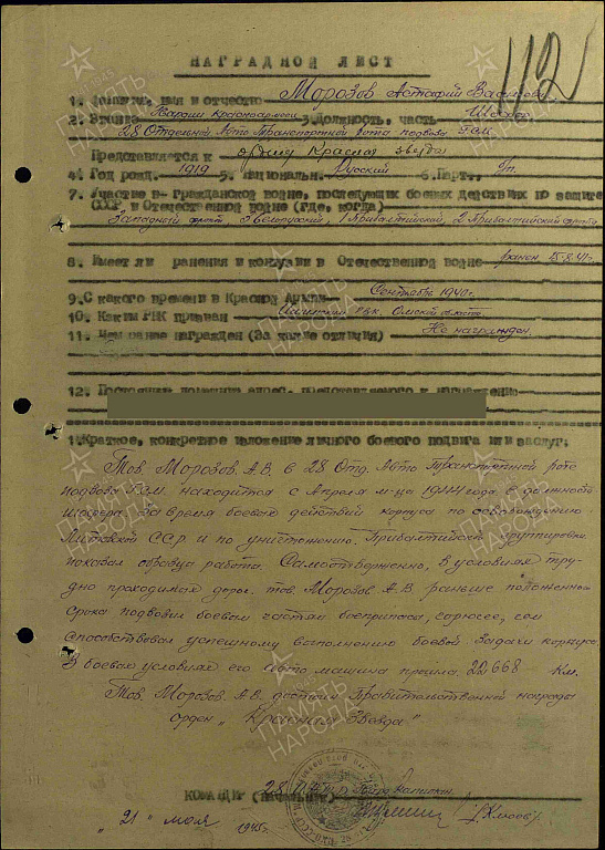 Награды: «Орден Красной Звезды», медаль «За победу над Германией в Великой Отечественной войне 1941–1945 гг.»