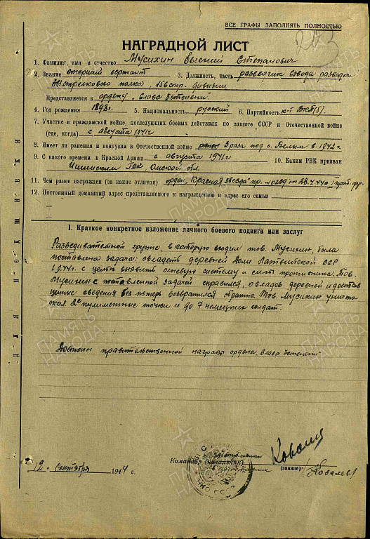 Дата и место призыва: _.08.1941 г., Ишимский ГВК, Омская обл.