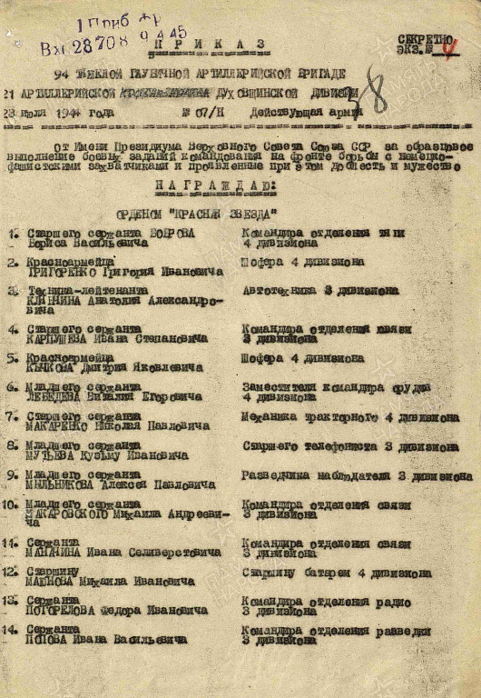 Место службы: 94 тяжелая гаубичная артиллерийская бригада