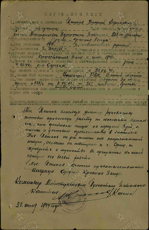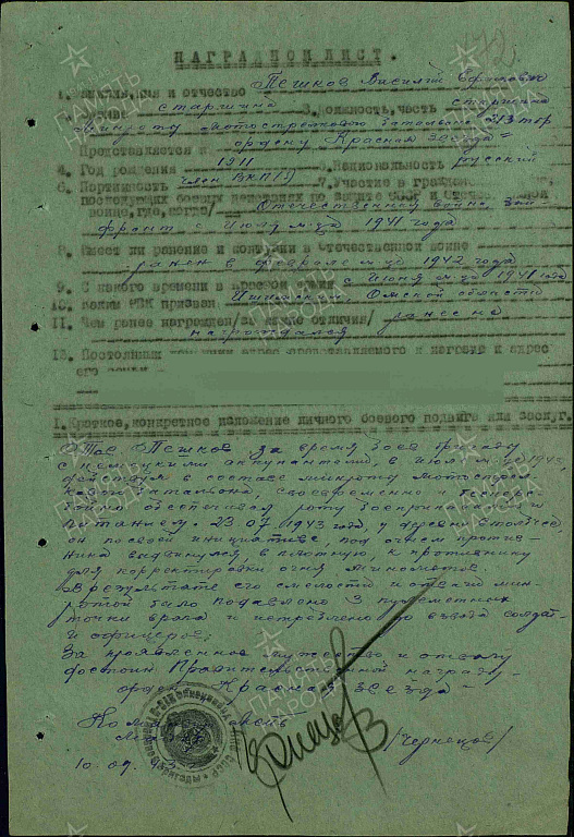 Дата и место призыва: 23.06.1941года Ишимский РВК, Омская обл., Ишимский р-н