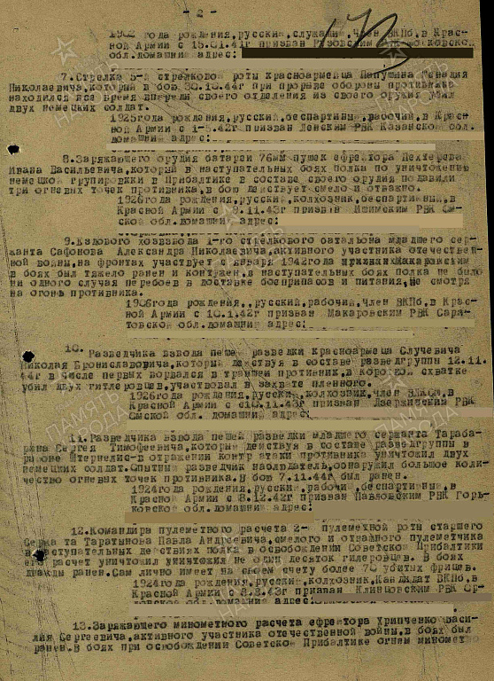 Место службы: 12 гвардейская стрелковая дивизия 447 стрелковый полк 397 стрелковой дивизии
