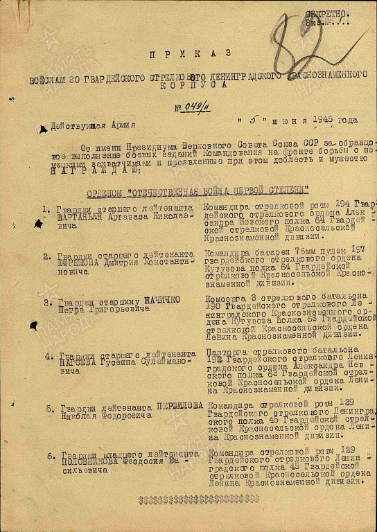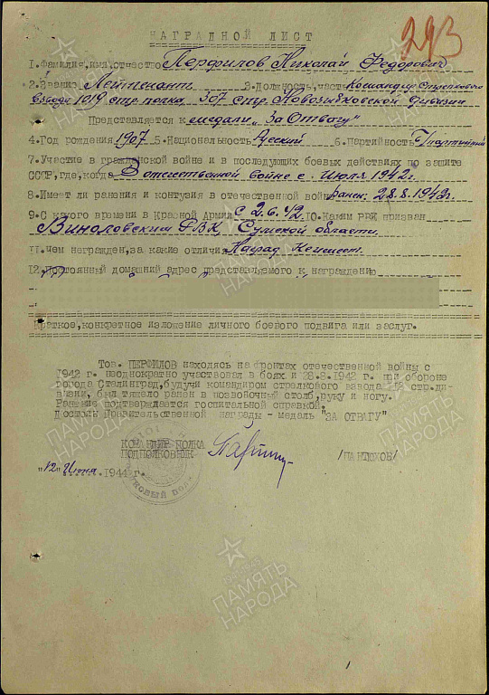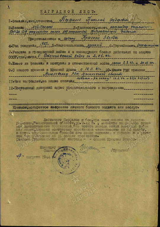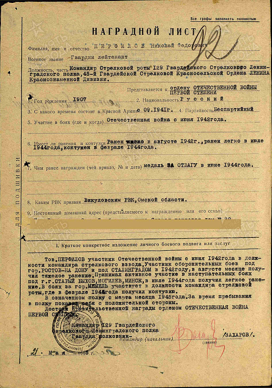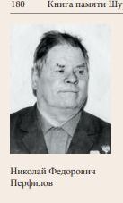Перфилов Николай Федорович родился в 1907 году Гражданская специальность Николая Фёдоровича - зоотехник. До воины окончил 2 Харьковскую пограничную школу. На войну попал в 1941 году из Викуловского района. Тюменской области. В 1942 года послали с фронта учиться в Могилёвское училище, там ему присвоили звание лейтенанта. После этого на 2 -ой Белорусский фронт командиром роты. Всю войну Николай Федорович был на фронтах на Втором Балтийском. Прибалтийском. На Прибалтийском фронте окончил войну. Имеет правительственные награды: Орден 1 степени Отечественной войны, орден Красной Звезды, медаль за Отвагу. Его боевой путь прошел через города Могилев. Минск. Гродно. Николай Федорович вспоминает: После Сталинградского фронта попал на Второй Белорусский. Стояли в обороне возле города Быкова. Меня и еще несколько моих товарищей вызвали в штаб армии и дали задание - пойти в тыл врага на помощь партизанам в местечке Гут. Там находился немецкий штаб. Вместе с партизанами нам надо было окружить штаб и уничтожить. Задание мы выполнили - штаб был разбит. После выполнения задания за нами прилетел самолет и нас перебросили за линию фронта. За эту боевую операцию я был награжден орденом Отечественной войны 1 степени. На Сталинградском фронте меня и еще трех бойцов послали в разведку на хутор Михаилонко. нам нужно было узнать, сколько немецких солдат и автомашин на хуторе. Когда мы уже возвращались в свою часть, по дороге встретили мальчика из хутора и стали расспрашивать его. у кого из жителей стоят машины. Вдруг к нам неожиданно подошел мужчина и стал требовать наши документы. Потом пригрозил, что уведет нас в полицию. Нам пришлось его убрать. Мальчик рассказал у кого и сколько в хуторе машин. Вдруг на дороге появились два немца и 2 женщины. Я подал команду, бойцы схватили немцев, увели их в камыши а женщин мы предупредили, чтобы не шумели. Мальчика мы отпустили и он пошел домой. За эту операцию я был награжден орденом Красной Звезды.